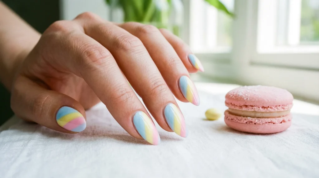 Use highly pigmented pastel gel polishes like Modelones Pastel Gel Set or Beetles Spring Collection. Striping tape or a thin nail art brush helps create those clean diagonal lines. Apply each stripe separately, curing fully before moving to the next color. No shortcuts here — clean edges need patience.