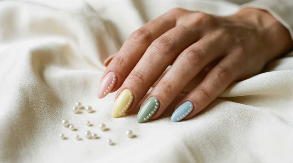 Every April I start craving softer colors again, and this manicure captures that mood perfectly. Almond-shaped nails in a watercolor palette — blush pink, butter yellow, sage green, and powder blue — are given a quiet upgrade with tiny pearl-like dots along the side of each nail. The dots add texture without overwhelming the softness. It’s subtle, polished, and completely wearable for everyday life.