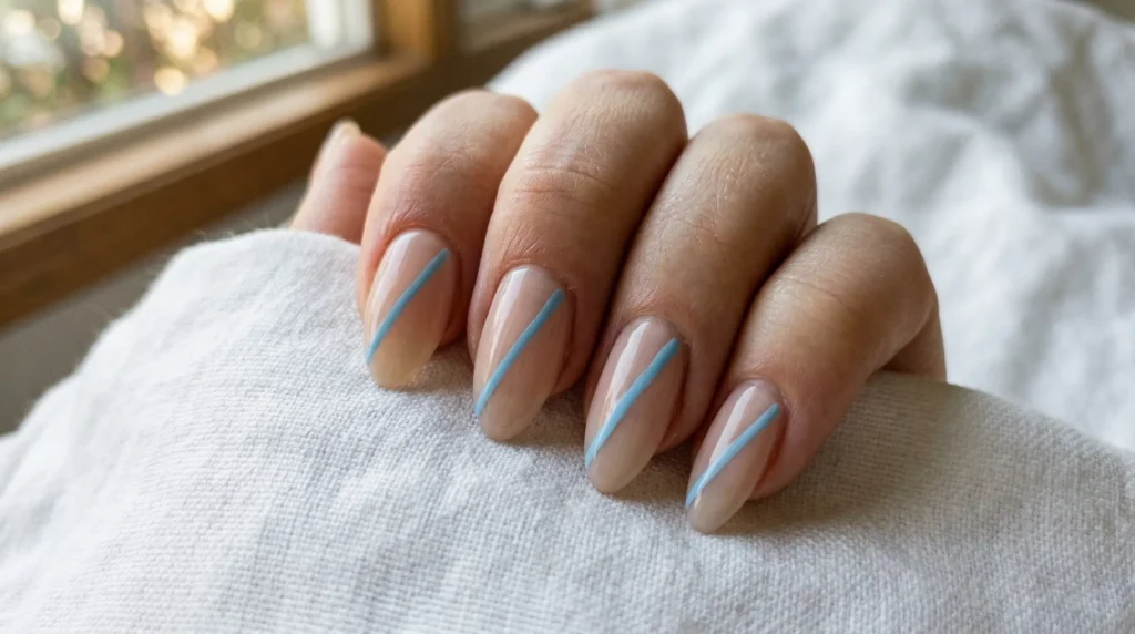 Sometimes the most refreshing spring manicure after months of heavy winter tones is the most minimal one. This design combines a sheer nude base with soft blue diagonal lines and angled tips — clean, graphic, and almost architectural. The almond shape keeps it elegant, and the airy spacing makes the whole look light and modern.