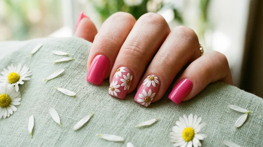 4. Pink Daisy Accent Nails for Playful April Florals