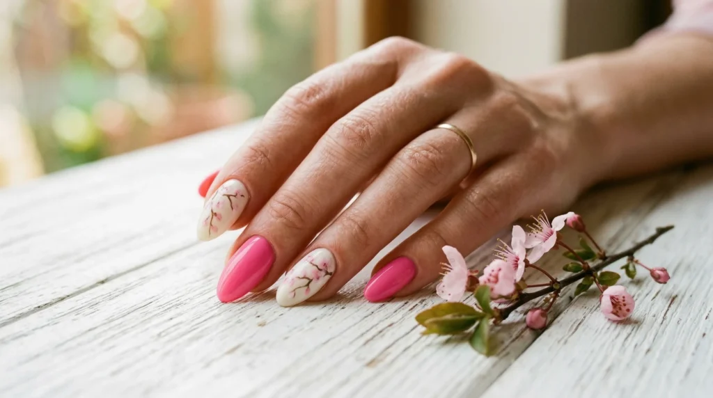 Some nail designs feel almost poetic, and cherry blossom nails are at the top of that list. A creamy white base with delicate pink painted branches creates a look that feels serene and romantic. Bright pink accent nails add just enough contrast, making the entire manicure feel balanced without being too matchy. It’s a refined, graceful entry into April nails ideas 2026 spring manicure trends.