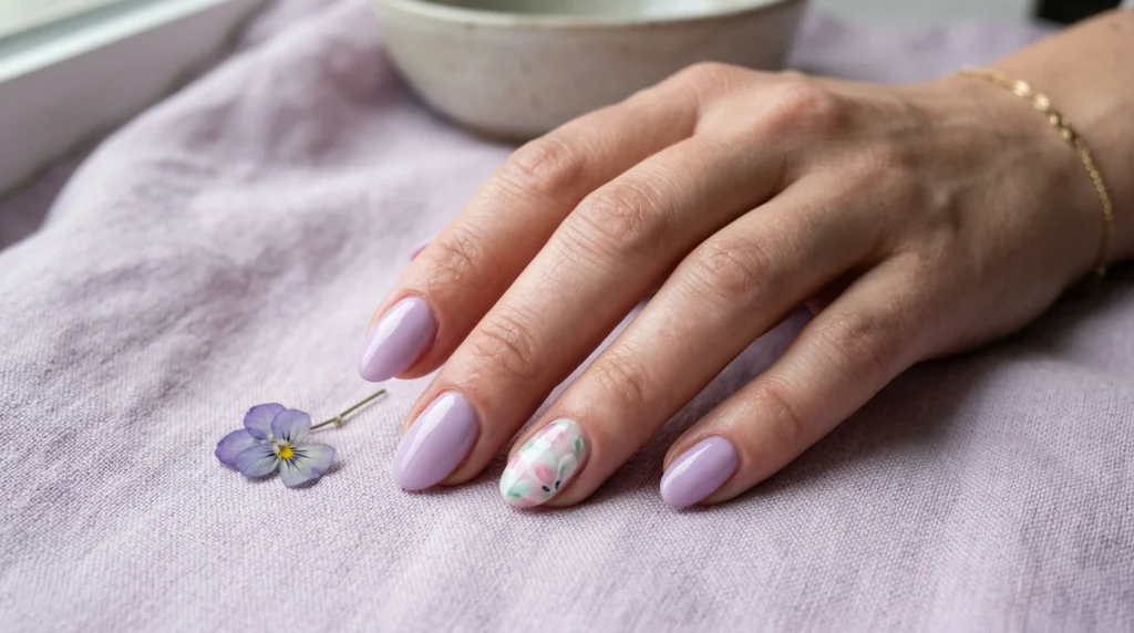 Lavender returns every spring without fail, but this glossy minimal version feels especially fresh. The short rounded shape is practical and wearable. The creamy lavender is clean and optimistic. And then there’s the single accent nail — a soft abstract floral in pastel shades that looks almost like a tiny watercolor painting. That’s what elevates this into proper spring manicure trends 2026 territory.