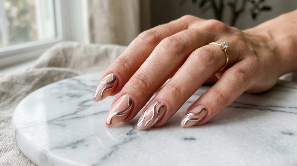 Start with CND Shellac Bare Chemise or OPI Put It In Neutral as your base. The metallic waves come from chrome gel paints — Born Pretty Mirror Chrome Gel in rose gold and silver. Use a thin liner brush to shape those fluid curves, and seal with a glossy top coat to keep the metallic finish vibrant.