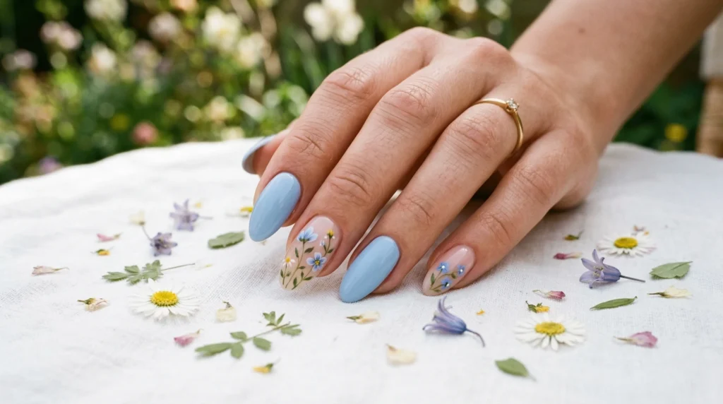 Soft blue nails remind me of clear April skies after a rainy morning. This manicure uses powder blue gel polish on several nails, while others feature delicate floral artwork on a sheer nude base — gentle blue petals, green leaves, and tiny yellow centers. Fresh, botanical, and very much aligned with spring manicure trends 2026.