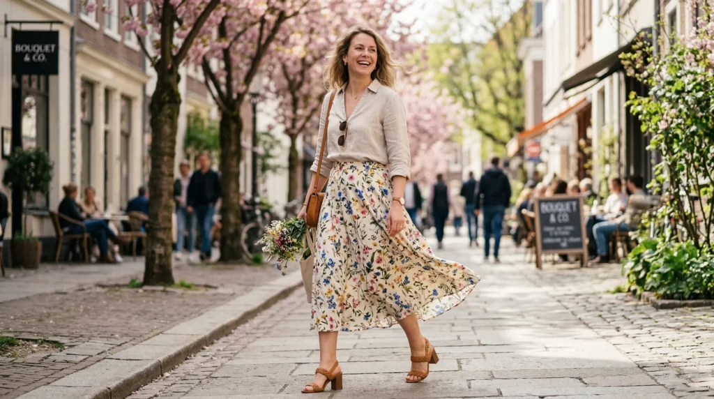 We can’t talk about spring outfit styling tips without coming back to shoes. Mules are incredibly versatile this season — they work with nearly every skirt length. Strappy sandals are perfect for warmer days. And if the weather is still a bit cool in early spring, white sneakers or ankle boots keep things grounded.