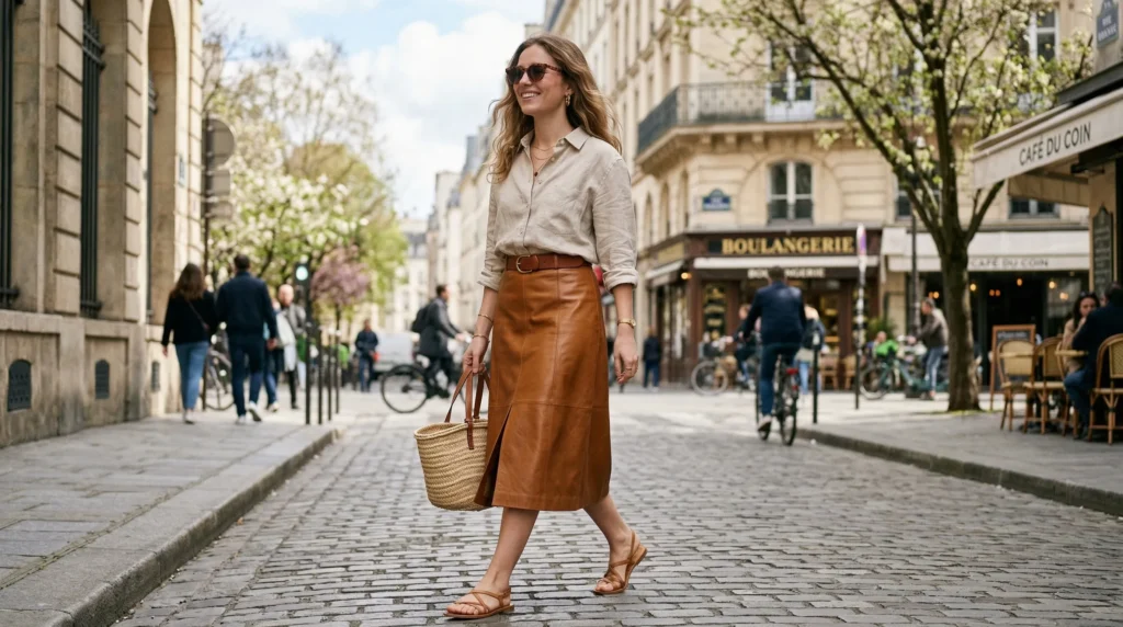 In my experience, a leather midi skirt is one of those pieces people are afraid to try but always love once they do. The key is balance — keep everything else soft and relaxed. A breezy linen shirt tucked in halfway, flat sandals, and minimal jewelry. The leather does the talking.