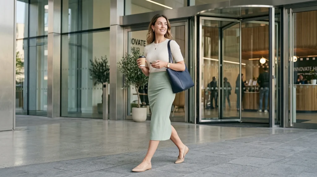 | Pencil / Tailored Skirt | Knit top, pointed flats | Office, smart casual |