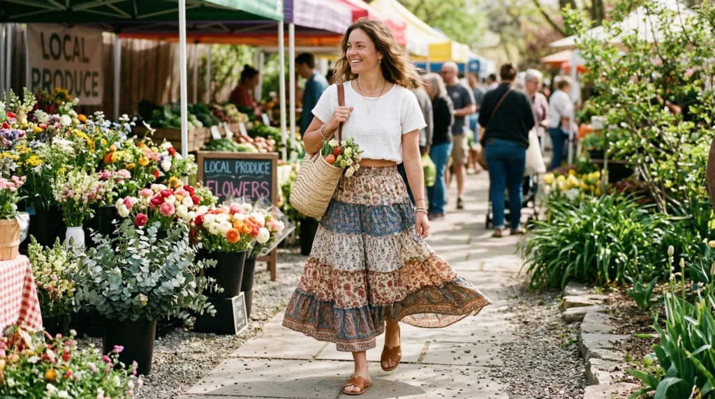 For those who love a more relaxed, free-spirited vibe, the tiered boho maxi skirt is a must-try this season. Think lightweight cotton, lots of movement, earthy tones mixed with vibrant prints. It’s one of the most comfortable spring skirt outfit ideas out there, and it photographs beautifully too.