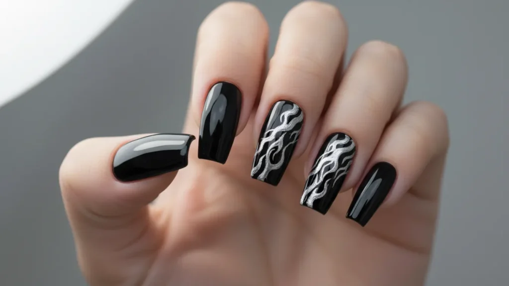 The black chrome base is super glossy and reflective, while those hand-painted silver flames give off major mystical energy. What’s cool is how the design flows organically across the nail rather than being perfectly symmetrical, making each nail feel like its own little piece of art.