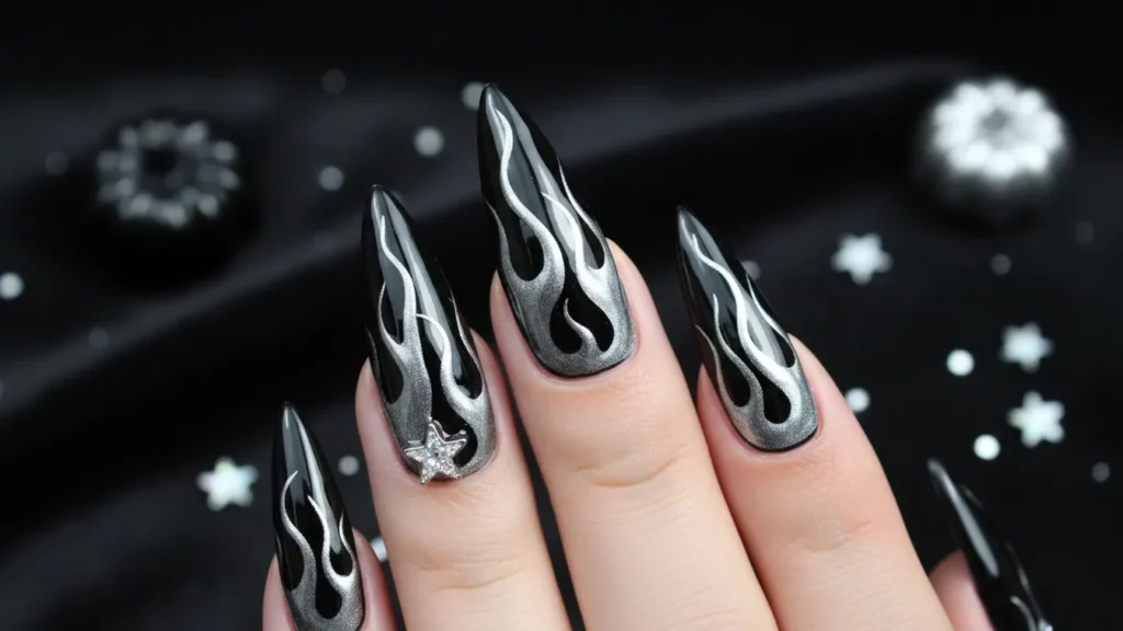 The silver flame design running down these stiletto nails is absolutely fire (no pun intended).