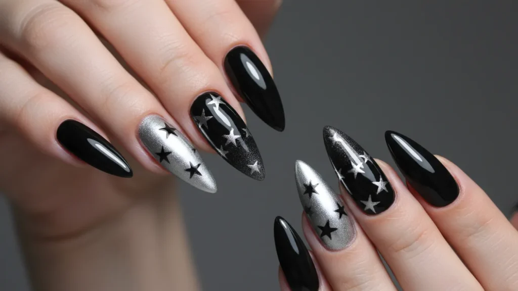 3. Black Chrome Ombre Stilettos with Silver Stars