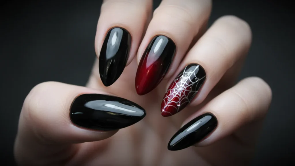 If you’re going for classic vampire or gothic glam, this combination of glossy black chrome, deep red ombre, and hand-painted silver spider webs is absolutely stunning.