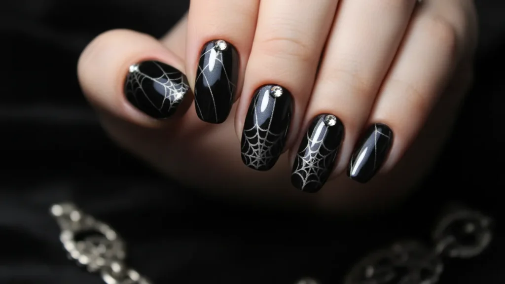 The combination of glossy black chrome, hand-painted silver spider webs, and strategic crystal placement creates such a luxe Halloween vibe. What really elevates this design is how the crystals catch the light alongside the chrome finish, creating this multidimensional sparkle effect.