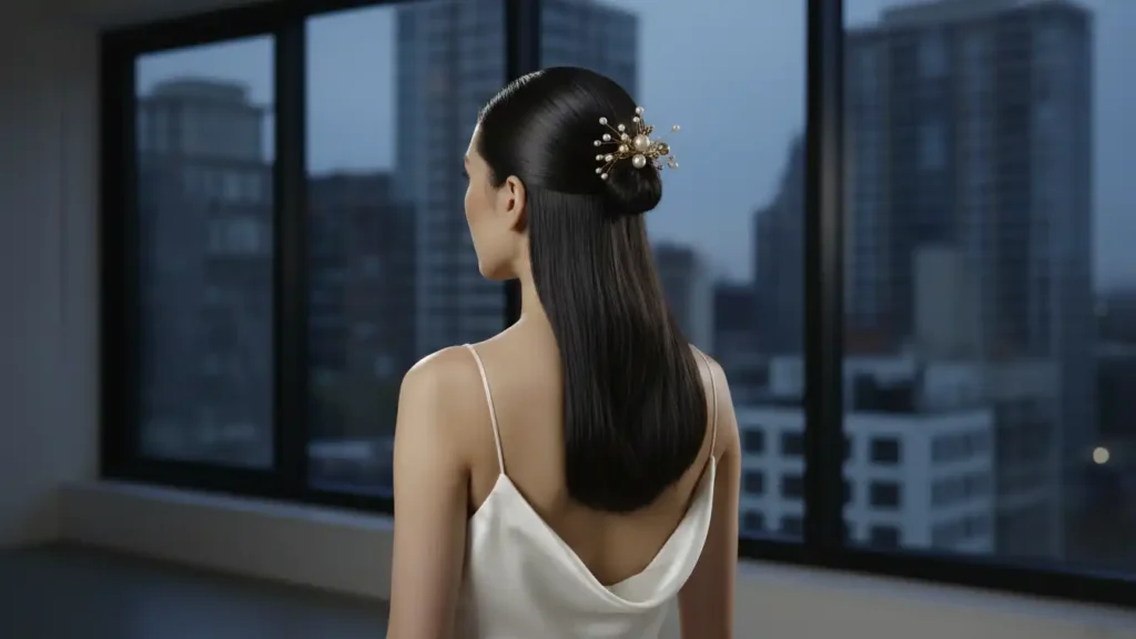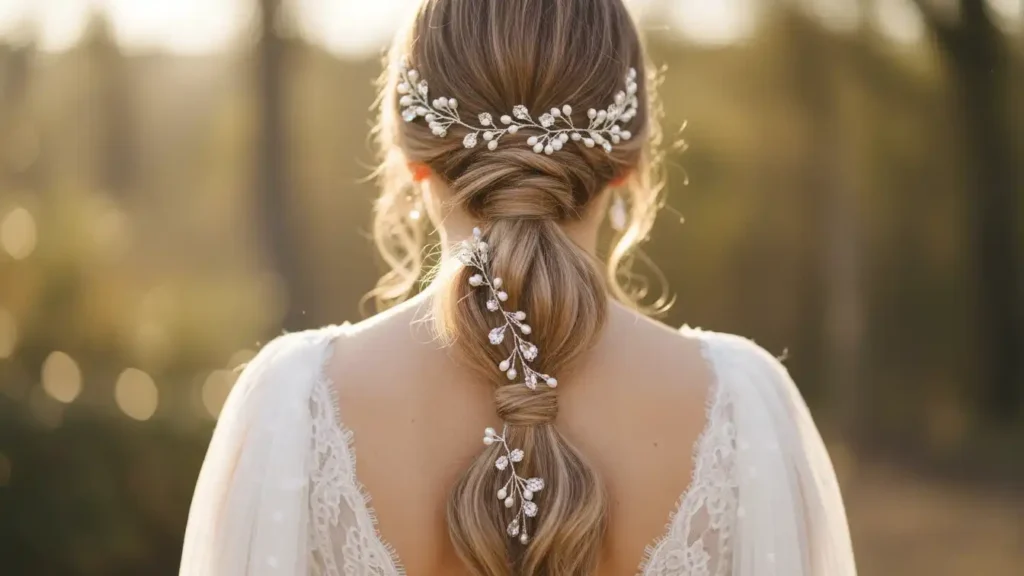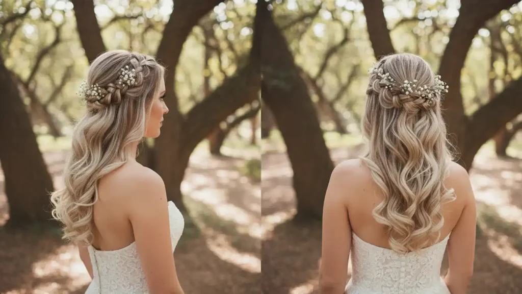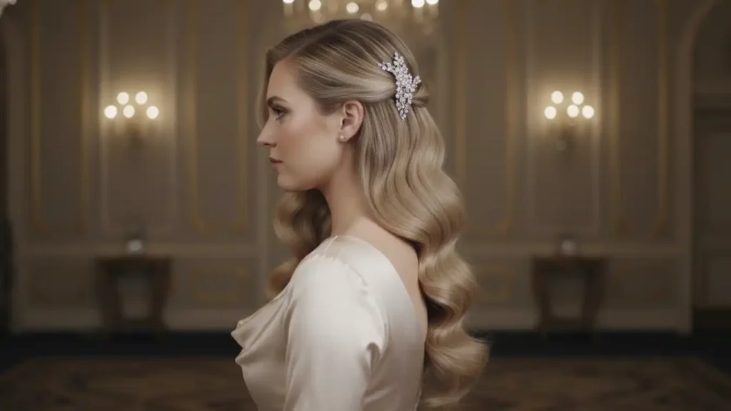 This polished half-up style combines simplicity with sparkle. Using decorative pins or jeweled accessories elevates the look from casual to wedding-ready in seconds.