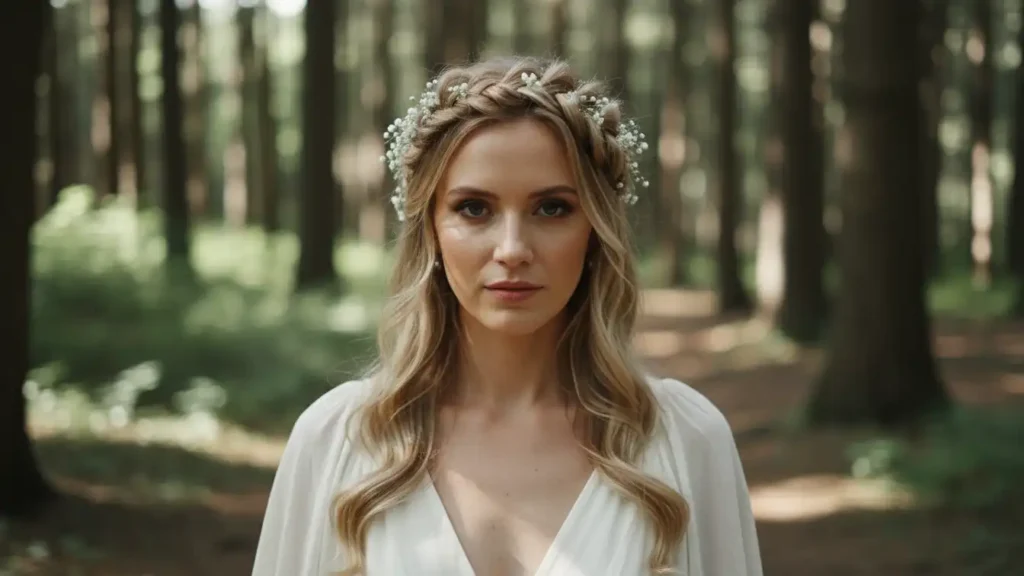 The crown itself brings in fresh garden vibes—perfect for rustic, outdoor, or beach weddings. Add a delicate ribbon tie and you’ve got a bridesmaid hairstyle that’s equal parts playful and enchanting.
