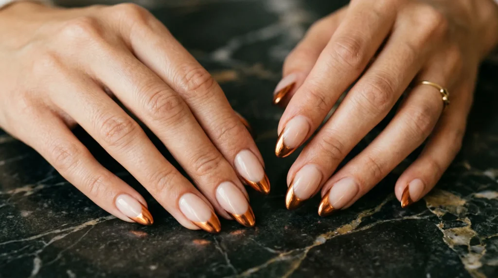 This is one of the most compelling brown nail designs 2026 precisely because it takes something familiar and makes it feel genuinely new. The copper tone sits in that warm brown-orange family that works with everything from neutral wardrobe tones to bold fashion choices. The chrome finish is what elevates it from a regular French tip into something with real editorial presence.