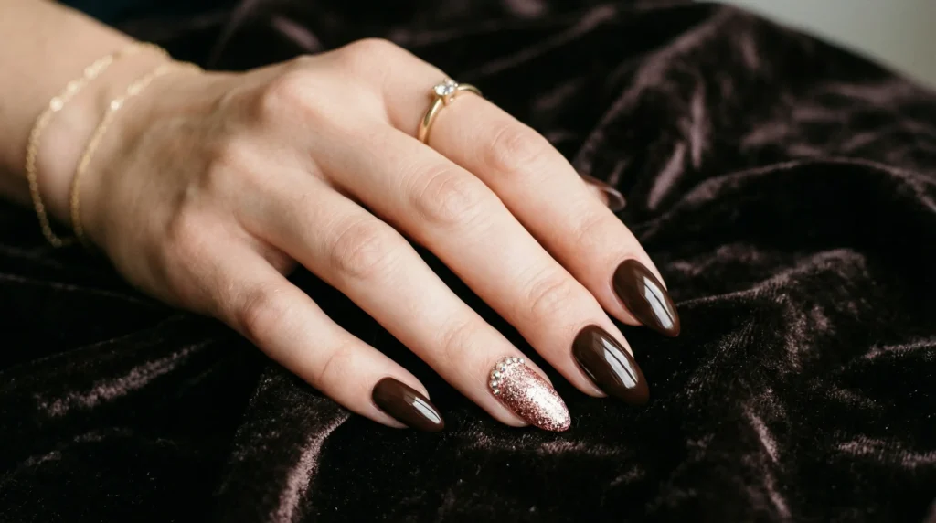 Clean, classic, and genuinely glittery. Deep chocolate almond nails as the base with a single rose glitter accent nail crowned with rhinestones whispered along the cuticle edge rather than placed loudly. Business-like during the day and as celebratory as champagne by evening. This is brown nail art at its most adaptable.