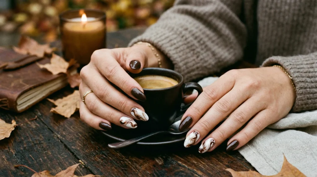 What I love about this specific brown nail art direction is the versatility of the finished result. Knit scarves, leather jackets, tailored coats. All of them work. It doesn’t require loud colors to communicate complexity. The depth is entirely in the swirling dark-and-light relationship.