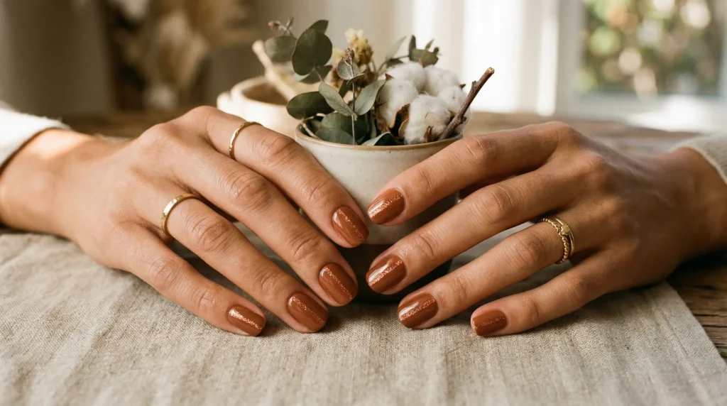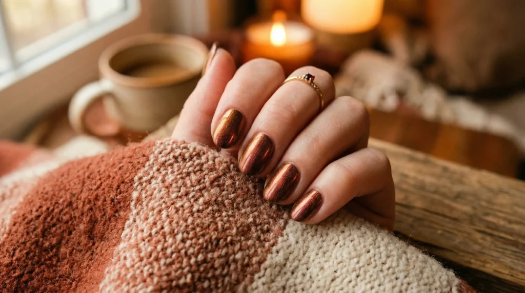 In my experience, warm shimmer brown nails are consistently the most complimented in this color family. People can’t always identify why the shade is interesting. They just know it is. That mysterious quality is the copper glow-on-glow effect doing its best work.