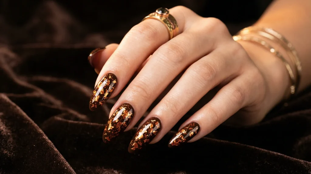 Long, glossy, dark brown nails filled with copper foil flakes that appear like molten lava coated in espresso. The shine is blinding. The texture is multidimensional. A rich, glowing statement manicure that somehow manages to remain grounded and comfortable to wear because the deep brown base keeps everything anchored.