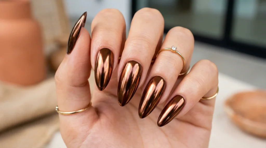 Ultra-reflective chrome in a deep copper finish cut into almond claws. Pure confidence. These nails don’t negotiate. The mirror reflection is so clear you can see yourself in it, and the color is heated molten metal at its most unapologetic. This is the brown nail design 2026 that ends this guide on the highest possible note of bold, fearless modern style.
