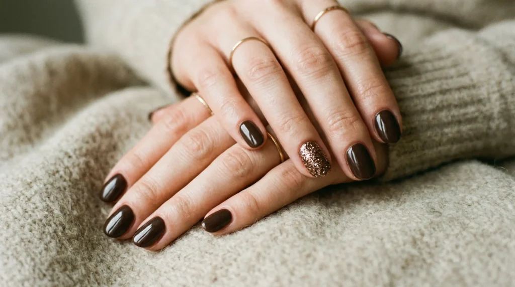 The espresso-and-glitter combination works because of tonal alignment. A bronze glitter accent in a warm brown context doesn’t create jarring contrast. It creates depth within the same color temperature. That’s the principle that separates a manicure idea that feels designed from one that feels random.