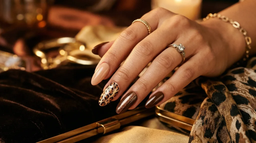 You don’t have to recreate every element for this to work. Maybe you do all chocolate with one leopard accent nail. Maybe you do nude and brown with one shimmer diagonal. The design is modular. You can adapt it to your confidence level with nail art and still end up with something that looks deliberately styled.