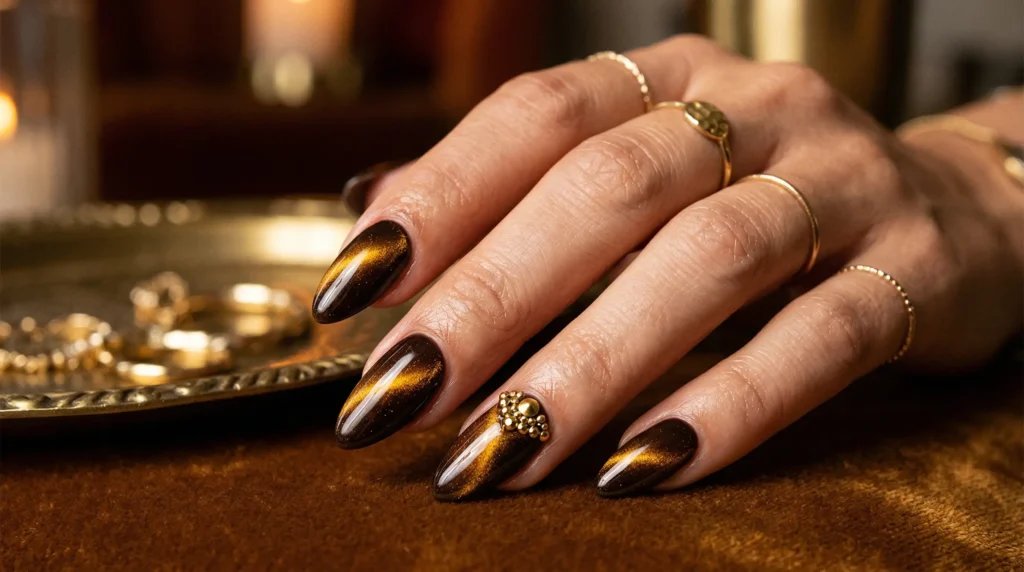 In my experience, these nails in sunlight during a conversation create a specific kind of visual drama that makes the whole interaction more interesting. They get you noticed in a warm, sophisticated way, like being in a dark jazz club with warm lights. That specific quality of glowing without glaring is exactly what great brown nail art should achieve.