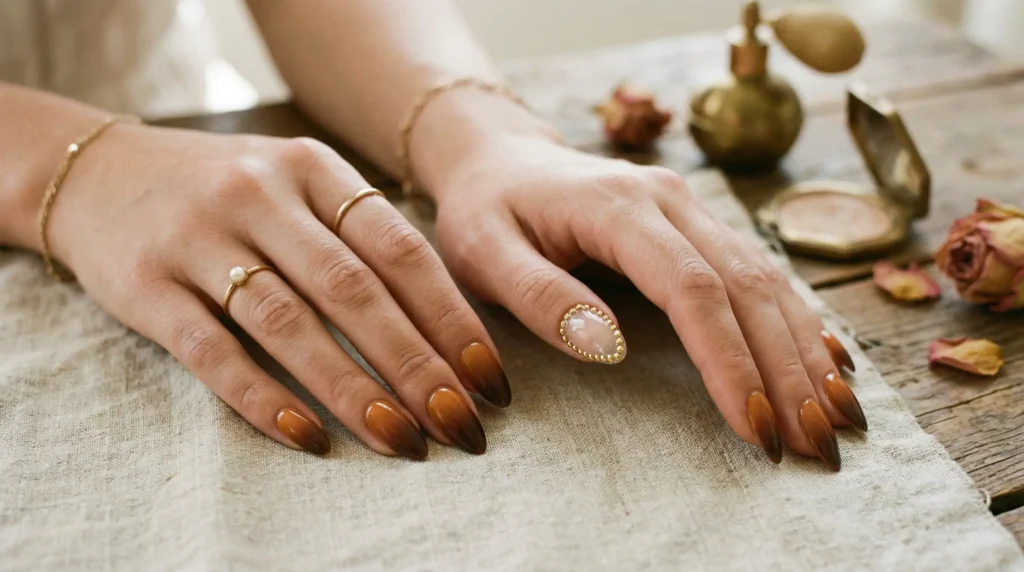 For the gradient, mixing two tones within the brown family on a sponge and dabbing them across the nail creates a seamless transition. The trick is keeping each layer thin and building up gradually. Rushing the gradient always creates visible banding. Patience between layers is what delivers that liquid, honey-in-hot-coffee quality.