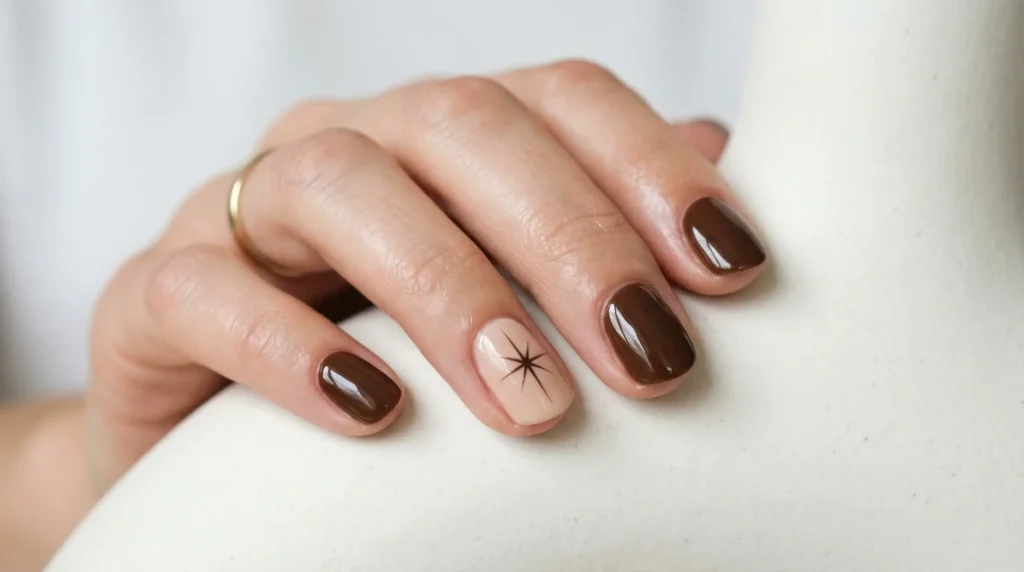 For those who prefer minimalism but still want their nails to communicate something specific, this design has your name on it. Short round nails in a deep rich chocolate gel with one nude accent nail featuring a small starburst line art painted in espresso. Scandinavian-aesthetic micro art. Clean, calm, and genuinely stylish.