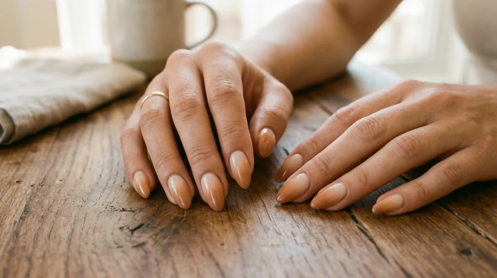 For a gentler approach to brown nail designs 2026, this gradient combines warm beige, toffee, and soft tan tones that harmonize across almond-shaped nails. The finish is milky and glossy, like lattes on your fingertips. Simple, genuinely beautiful, and perfectly suited to relaxed occasions or neutral wardrobe dressing.