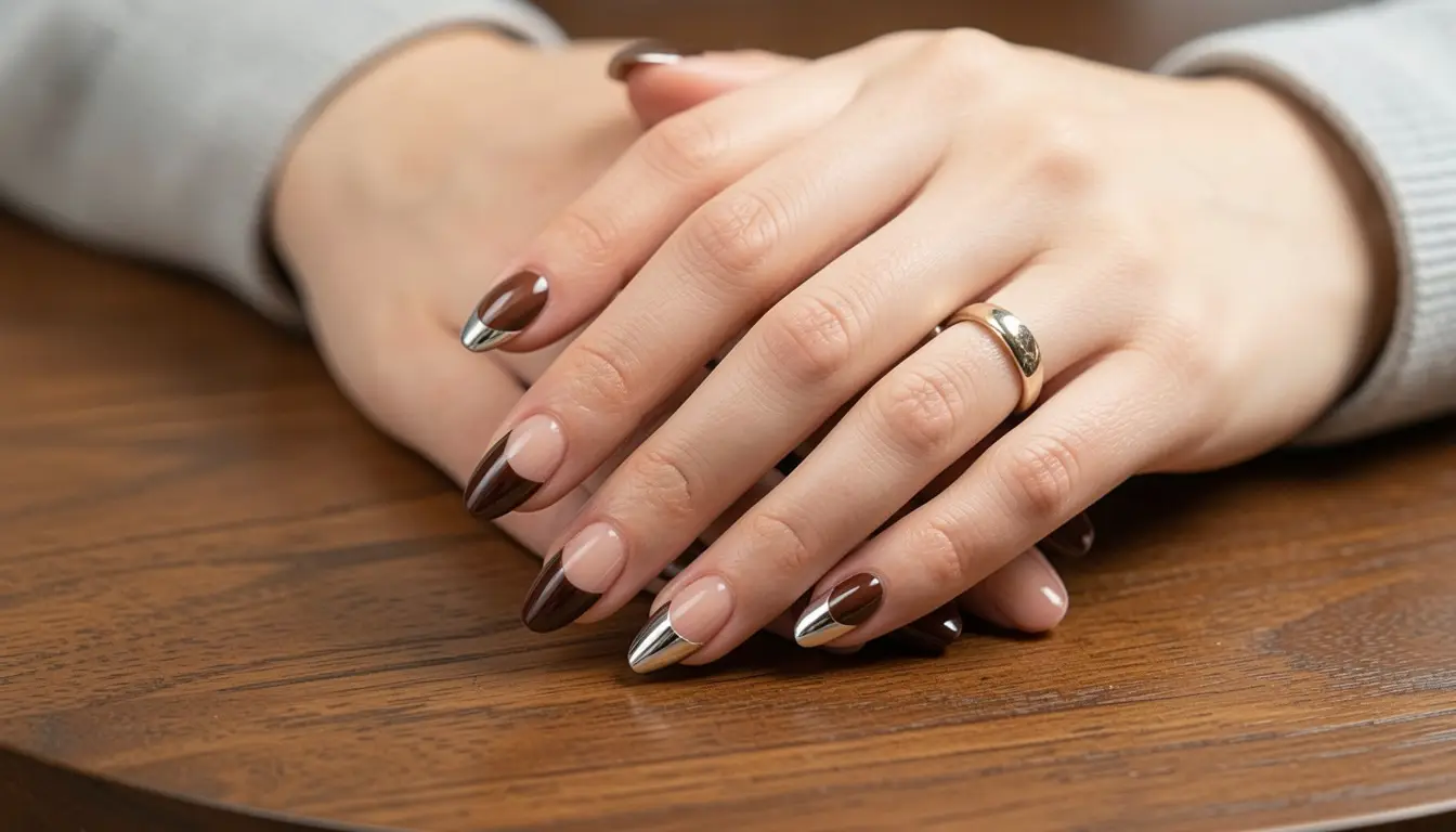 This is one of the most compelling brown nail designs 2026 precisely because it takes something familiar and makes it feel genuinely new. The copper tone sits in that warm brown-orange family that works with everything from neutral wardrobe tones to bold fashion choices. The chrome finish is what elevates it from a regular French tip into something with real editorial presence.