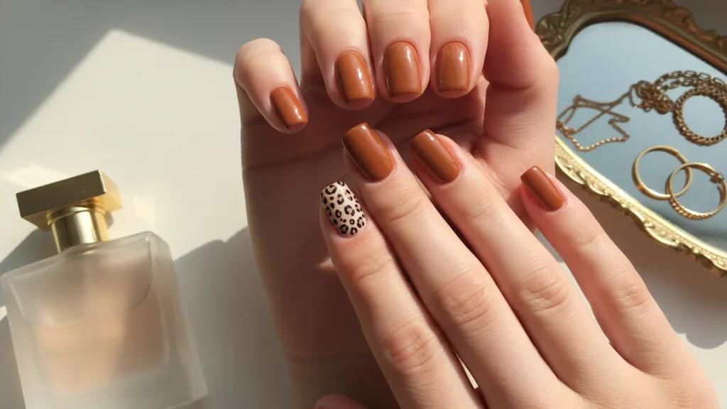Add tiny leopard-inspired spots to one or two accent nails while keeping the rest a solid chocolate or caramel shade. This gives you pattern and personality without going full animal print.