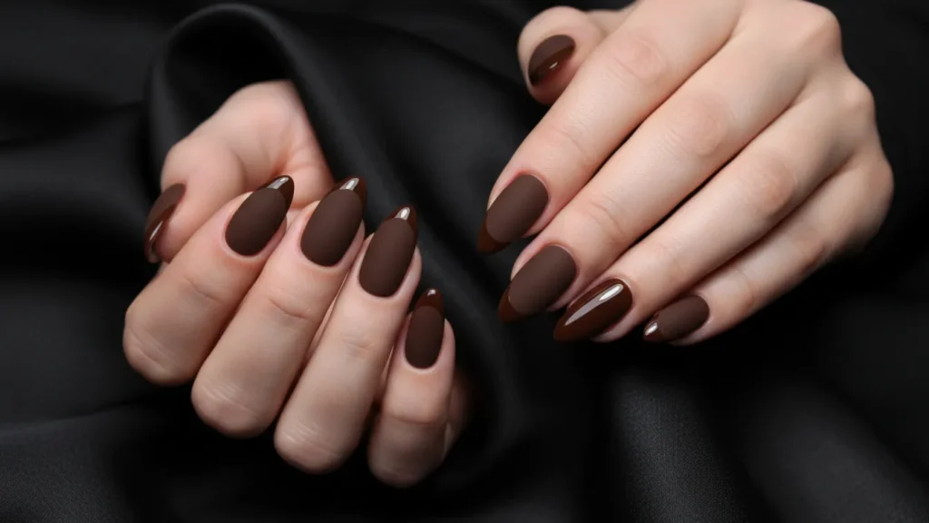 Flip the traditional French manicure by using a matte brown base with glossy brown tips. The texture contrast creates this sophisticated, editorial effect that feels very high-fashion.