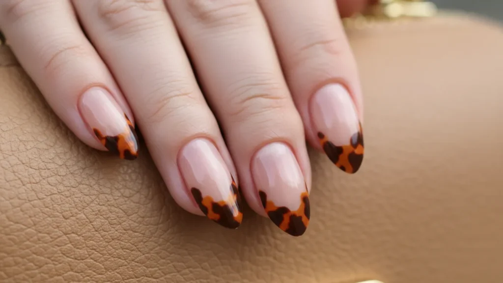 Tortoiseshell nails are always in style, and doing them as French tips keeps the look fresh and modern. The warm brown swirls layered over a nude or clear base create this luxurious effect that works for both everyday wear and special occasions.