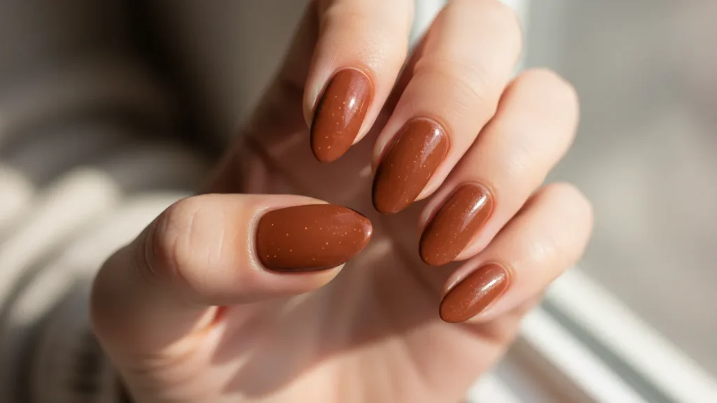 A warm cinnamon brown manicure with fine shimmer particles creates this glowing, dimensional effect that’s especially gorgeous in natural light. It’s more interesting than flat matte but less bold than full metallic.