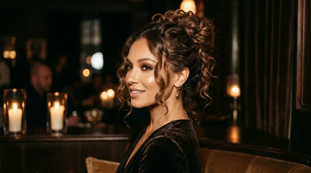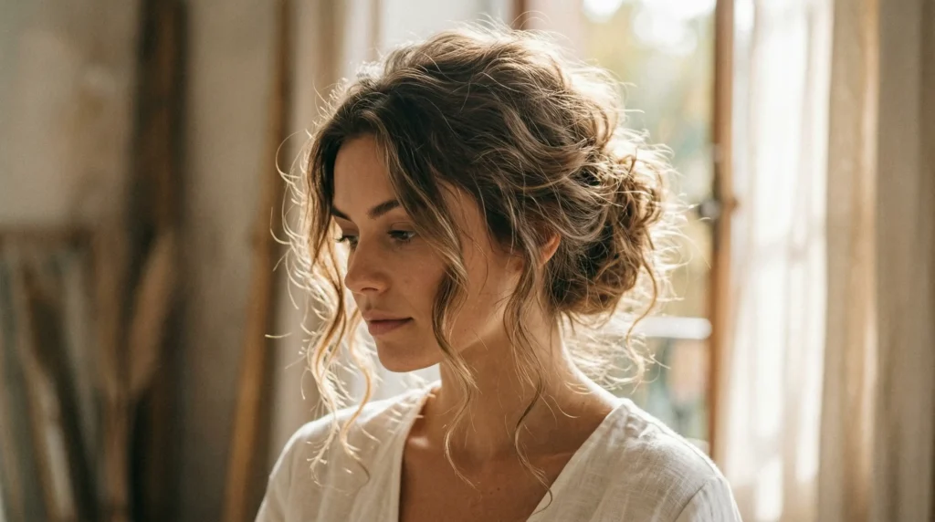 Big loose curls built with a large barrel iron, the head flipped upside down, a shake for volume, then sections pinned in layers rather than gathered all at once. The goal is not a neat bun. It’s a bun that looks like it became a bun naturally, which is paradoxically the most difficult quality to achieve deliberately.