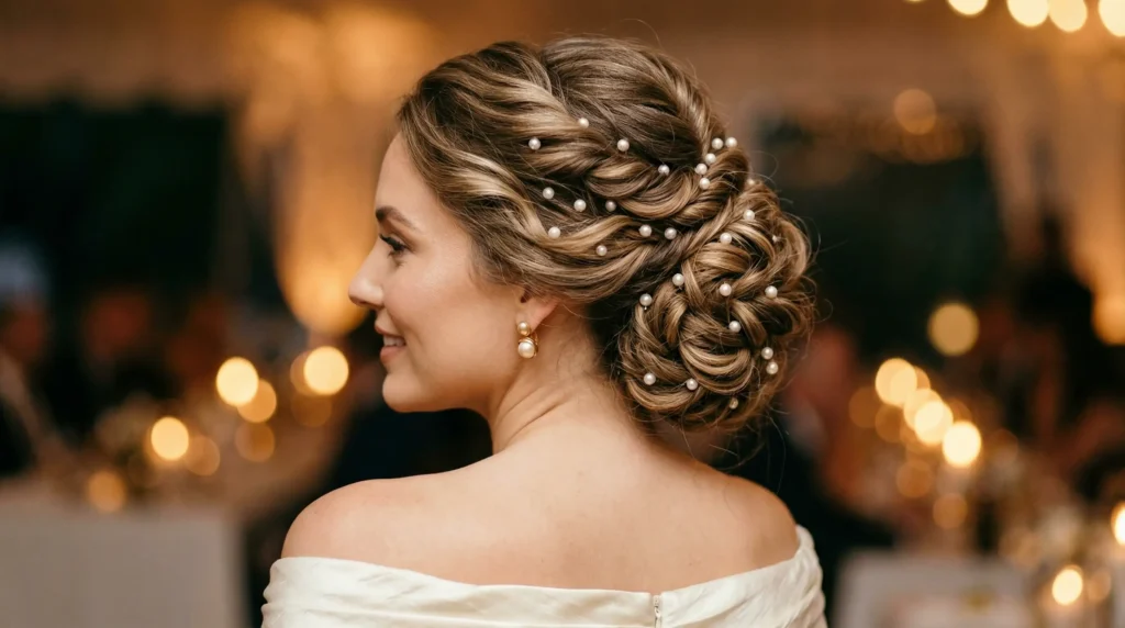 | Pearl-Strewn Textured Bun | Ethereal, romantic, editorial | Winter weddings, parties |