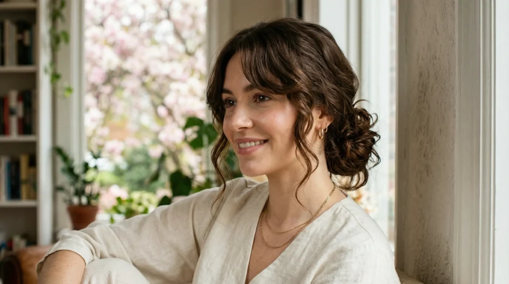 A leave-in conditioning spray before heat styling creates natural movement in the curtain bangs. A round brush blowout sets the face-framing pieces correctly. The bun itself is constructed loosely with a few strategically placed pins rather than wrapped tightly.