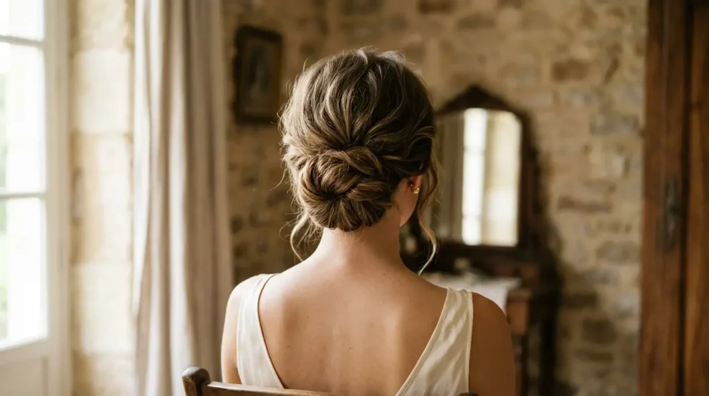 In my experience, this is the updo that photographs equally well from every direction. That quality is genuinely rare. It’s perfect for wedding guests, equally good for a dinner with friends, and it adds a collarbone-shimmer quality that makes even a simple neckline look more considered.