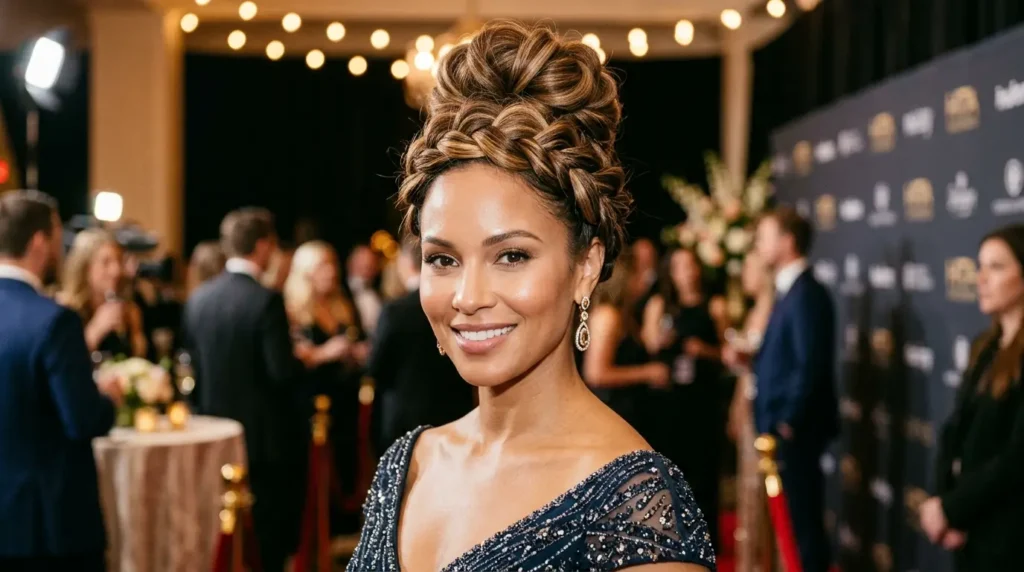 This one is close to art, and I don’t use that word loosely. Hair parted and twisted around the head, woven into a high bun where warm blonde and chestnut highlights become the visual stars of the whole composition. The kind of bun hairstyle 2026 that makes people stare at a party, a red carpet, or any occasion with good lighting.