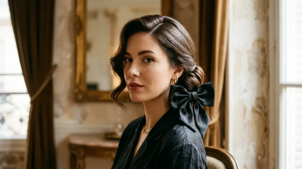 A black satin bow on a traditional twisted low bun. Vintage in the best sense, with smack-down face-framing waves and a deep side part that provide structure. But the real mood carrier is the bow itself. It transforms an otherwise standard low bun into a genuine statement about who you are and how you want to show up.