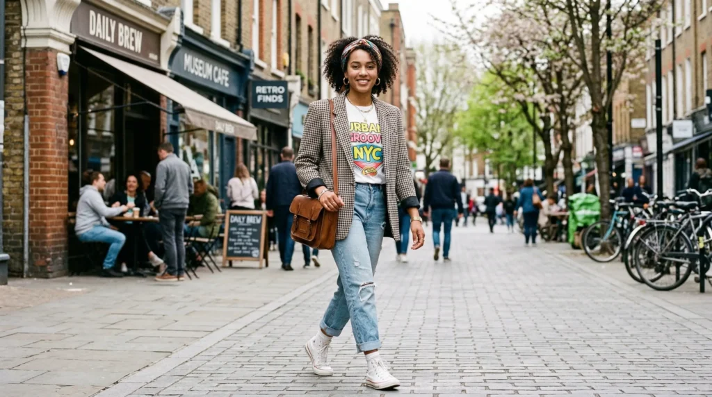 There’s something infectiously confident about a woman who wears vintage street-style energy like armor. This look takes the relaxed structure of a houndstooth blazer and makes it sing next to a graphic tee. Tucked into relaxed-fit rolled-up jeans and finished with white high-top sneakers, it reads like a 2026 nod to 1980s NYC. Cleaner, sleeker, and way more wearable.