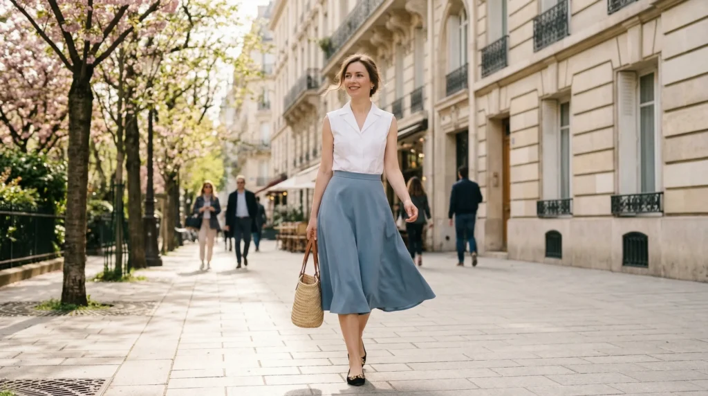 | Breezy Retro Office | Sleeveless blouse, A-line midi skirt | Spring commute, warm days |