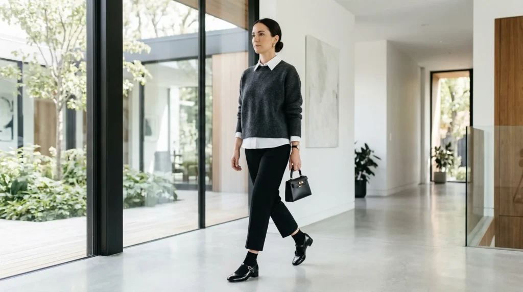 For warmer days, swap the sweater for a sleeveless cashmere vest or wear loafers instead of Mary Janes. Either way, this spring work look is already doing the quiet power move beautifully.