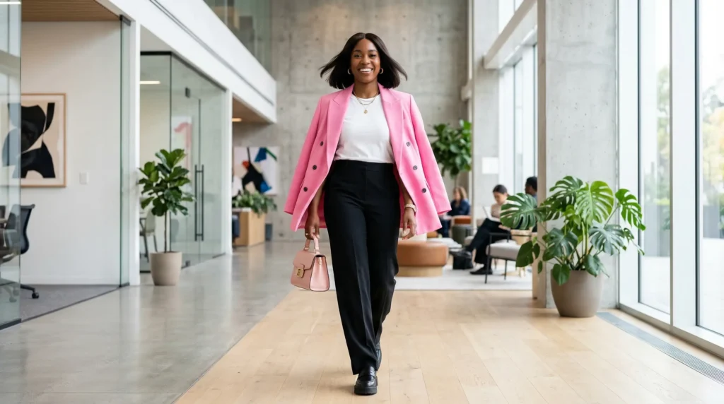 | Bubblegum Blazer Power | Pink oversized blazer, white tee, black trousers | Creative, Friday meetings |