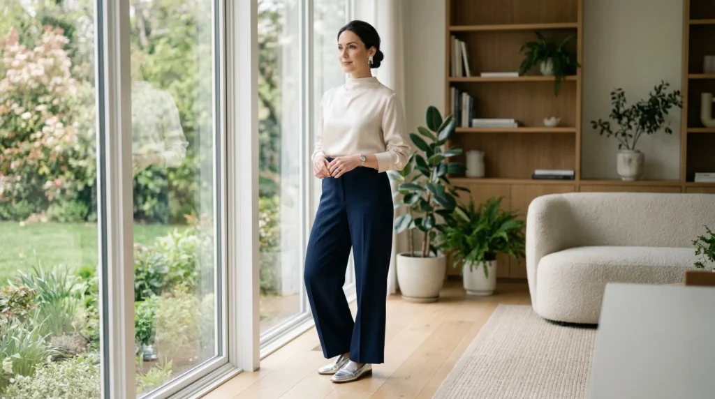 There’s nothing like the sleek drape of a satin blouse to genuinely elevate your mental game. A soft pearl-toned silk top with high-waisted navy wide-leg trousers is the essence of quiet luxury. Paired with silver loafers and geometric earrings, this look is bold in the most subtle way possible. Calm, composed, and incredibly current.