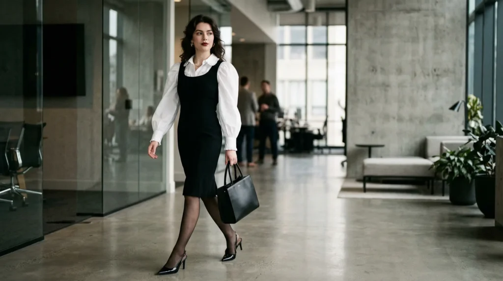 There’s nothing basic about a black mini dress when it’s styled with this much thought. A puff-sleeved white blouse sits beautifully beneath a sleeveless black sheath dress, bringing in texture, volume, and a refined contrast. Black sheer tights and sharp-toe heels give it a soft gothic edge. The black structured tote keeps everything sleek and completely professional.