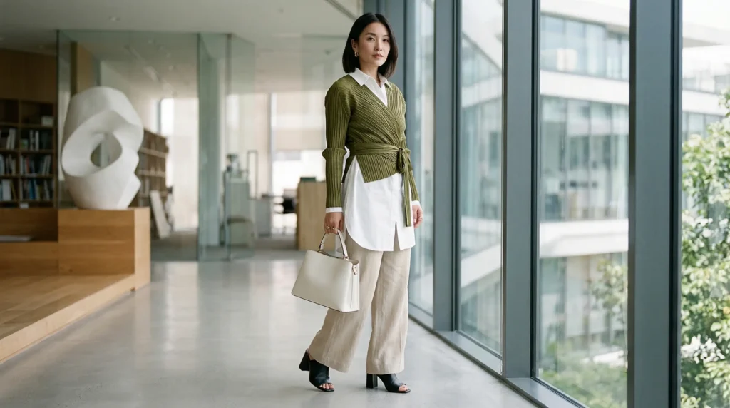 | Pleats and Layered Elegance | Olive wrap top, long white shirt, beige trousers | Editorial, avant-garde office |