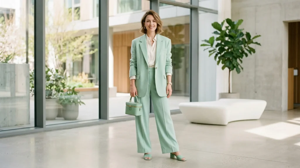 | Soft Power Pastel Suiting | Mint green blazer + wide-leg trousers | Corporate, client meetings |